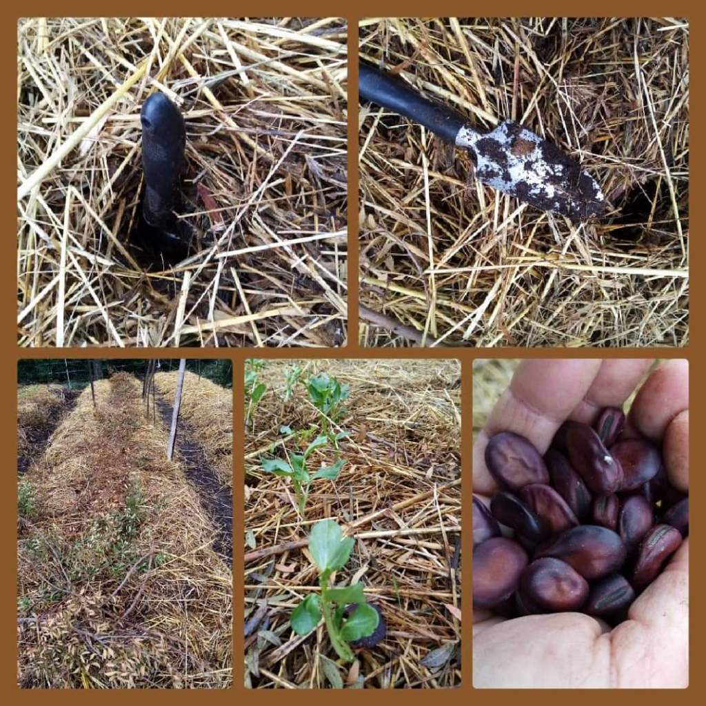 Chez #lesjardinsdetara, semis de Fèves noires du Maroc dans une butte de fumier recouverte de paillis. Les graines sont enfouies à 20 ou 25 cm de profondeur… avec des branchages ou des cagettes en protection contre les oiseaux et lapins le temps du démarrage.